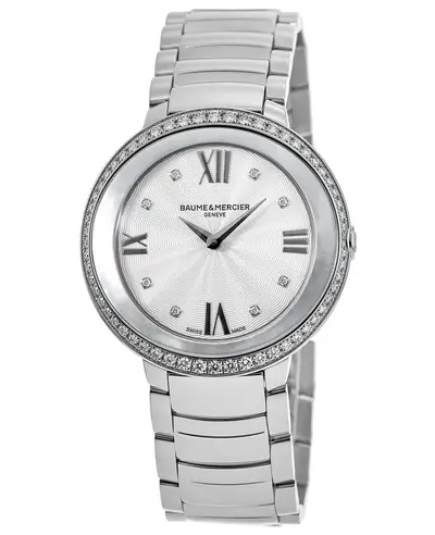 A steel and diamond watch from Baume & Mercier, model number 10199 or MOA10199. It features a polished stainless steel round case measuring 34mm in diameter with an additional thickness of 8.16mm. The solid silver dial displays Roman numerals alongside diamond-set hour markers totaling eight stones. Powered by battery quartz movement, it includes a push-in crown and is protected by scratch-resistant sapphire crystal glass. Equipped with a matching polished stainless steel bracelet featuring a hidden deployment clasp closure system. The bezel itself incorporates 61 sparkling diamonds arranged around a white mother-of-pearl element. This piece offers water resistance rated at 30 meters (equivalent to approximately 100 feet) and comes backed by a standard two-year WatchMaxx warranty.