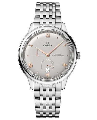Authentic Omega De Ville Chrono Date watch with grey dial and stainless steel case featuring a deployment clasp. Equipped with automatic Calibre 8810 movement providing 55 hours power reserve. Includes rose gold tone hands, Roman numeral/index hour markers with minute markers around the outer rim, date display at the six o'clock position, small seconds sub-dial, and power reserve indicator sub-dials. Comes with a stainless steel bracelet band, scratch-resistant sapphire crystal lens, round 41mm case thickness of 10.8mm, transparent case back, and is water resistant to 30 meters (approx. 100 feet). This watch has a two-year WatchMaxx warranty.