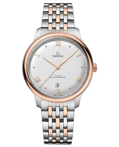 Brand new authentic Omega De Ville Prestige Co-Axial Master Chronometer. Case size: 40mm diameter. Case thickness: 9.9mm. Round case shape constructed from both rose gold and steel materials. Features a silver dial with Roman numeral hour markers, tone hands, and minute markers on the outer rim. Equipped with an automatic movement powered by Omega Calibre 8800 engine providing a 55-hour power reserve. Includes date display function and power reserve indicator visible through the sapphire crystal case back which is also scratch resistant. Comes with a rose gold tone bezel set against a stainless steel bracelet secured via deployment clasp closure.