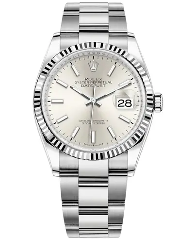 New authentic Rolex Datejust 36. Features a polished white gold and stainless steel Oyster case, solid link bracelet in white gold and stainless steel equipped with an Oysterclasp, fluted bezel, silver dial accented by luminous hands and hour markers including minute markers around the outer rim, automatic self-winding mechanical movement powered by Calibre 3235 with a 70-hour power reserve, standard date function at the 3 o'clock position, water resistance up to 100 meters (approximately 330 feet), screw-down crown, scratch-resistant sapphire crystal, round shape measuring 36mm in diameter, and comes complete with its original box and papers. 5-year WatchMaxx warranty included.