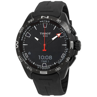 Black PVD titanium case with black rubber strap and ceramic bezel. Analog-digital display on a black dial featuring luminous hands/index hour markers, minute outer ring markers, perpetual calendar (including month, date, day), chronograph function, alarm function, GMT hand/second time zone indicator, thermometer, altitude indicator, barometer, compass functions, ETA E32.001 quartz movement, scratch resistant sapphire crystal lens, solid case back, round 47.5mm dial size with 23mm band width, tang clasp closure, water resistance to 100m/330ft (approximate), Bluetooth connectivity, and Swiss Made label.