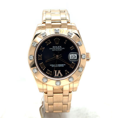 Lady Datejust Series watch. Swiss Made luxury analog timepiece with hours, minutes, seconds and date functions. Features a diamond set blue dial, Roman numeral hour markers, rose gold-tone hands, an 18kt rose gold case, pearlmaster bracelet in rose gold-tone finish, fixed bezel, screw down winding crown, solid case back, round shape measuring 34 mm diameter, automatic movement Calibre 2235 with approximately 31 jewels and a frequency of 28,800 vph (5 Hz), providing an estimated power reserve of about 48 hours. Equipped with a scratch-resistant sapphire crystal glass, it is water resistant up to 100 meters / 330 feet.