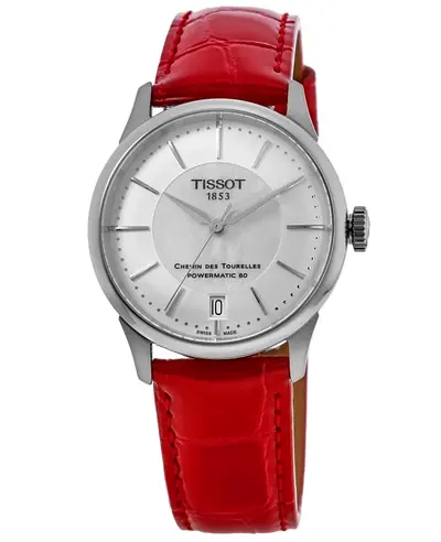 Authentic Tissot women's watch model t139.207.16.111.00, featuring a mother-of-pearl dial with silver tone hands and index hour markers plus minute markers around the outer rim. Equipped with an automatic Powermatic 80 movement providing an 80-hour power reserve. Comes in a stainless steel case accented by a red alligator leather strap fitted with a deployment push-button clasp. The round watch case measures 34mm in diameter and has a thickness of 10.5mm, featuring a transparent sapphire crystal back. Water resistant to 50 meters (approx. 165 feet). Includes date function and is covered by a 2-year WatchMaxx warranty.
