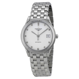 Analog quartz movement Longines Calibre L619 based on ETA 2892-A2, automatic winding, case size 35.6mm, thickness 7mm, stainless steel case with fixed bezel and bracelet. White dial featuring silver-tone sword-shaped hands and diamond hour markers. Includes date display at the 3 o'clock position. Equipped with scratch-resistant sapphire crystal glass, pull/push crown, transparent case back, hidden fold-over clasp (width: 17mm). Water resistant to 30 meters / 100 feet. Functions include date, hour, minute, second indication.