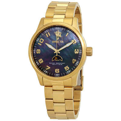 Yellow gold-tone stainless steel case and bracelet. Fixed yellow gold-tone bezel. Black mother of pearl dial with luminous yellow gold-tone hands and Arabic numeral hour markers. Minute markers around the outer rim. Dial Type: Analog. Moonphase indicator. Luminescent hands and markers. Caliber 9231K0 quartz movement. Scratch resistant sapphire crystal. Pull / push crown. Solid case back. Case size: 44 mm. Case thickness: 12 mm. Round case shape. Band width: 22 mm. Band length: 8.25 inches. Fold over clasp with a safety release. Water resistant at 30 meters / 100 feet. Functions: hour, minute, second. Casual watch style. Invicta Sea Base Black Mother of Pearl Dial Mens Watch 23826.