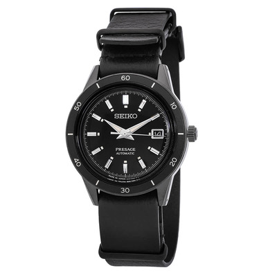 Black PVD stainless steel case with a black leather strap. Fixed black PVD stainless steel bezel. Black dial with silver-tone hands and index hour markers. Minute markers around the outer rim. Dial Type: Analog. Luminescent hands and markers. Date display at the 3 o'clock position. Seiko Caliber 4R35 Automatic movement, containing 23 Jewels, bitting at 21600 vph, and has a power reserve of approximately 41 hours. Scratch resistant Hardlex crystal. Pull / push crown. Transparent case back. Round case shape, case size: 40.8 mm, case thickness: 12 mm. Band width: 20 mm. Tang clasp. Water resistant at 50 meters / 165 feet. Functions: date, hour, minute, second. Presage Series. Casual watch style. Watch label: Japan Movt. Seiko Presage Automatic Black Dial Mens Watch SRPH95J1.