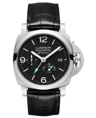 Brand New Authentic Panerai, Model PAM01302, Black Alligator Leather strap on Brushed Stainless Steel case. Silver tone hands with Arabic numeral/index hour markers and minute markers around the outer rim on a black dial featuring three sub-dials displaying small seconds and power reserve. Powered by Calibre P.9012 automatic movement with 72 hours power reserve. Includes date function at 3 o'clock, round case size of 44mm, transparent sapphire crystal back, scratch resistant sapphire crystal front, water resistance to 300 meters or 990 feet and a 2 year WatchMaxx warranty.