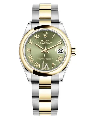 Brand New Authentic Rolex, case in polished stainless steel and yellow gold, bracelet in yellow gold and stainless steel oyster style with oysterclasp, fixed domed bezel, hands are luminescent yellow gold, Roman numeral hour markers set with diamonds including the VI position, date displayed at 3 on olive green dial, automatic chronometer movement powered by Calibre 2236, 55 hours power reserve indicator visible through sapphire crystal caseback, round shape measuring 31mm in diameter, solid screw-down case back, scratch resistant sapphire crystal, water resistant to 100 meters / 330 feet.