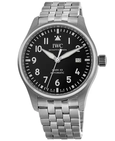 Brand New Authentic IWC watch. Steel case, steel bracelet. Fixed bezel. Black dial featuring luminous silver tone hands and Arabic numeral hour markers with minute markers around the outer rim; date window at the 3 o'clock position. Automatic movement powered by Calibre 32111 engine with 120 hours power reserve: functions include Hour, Minute, Second, Date display, and Power Reserve indication. Screw-in crown. Scratch resistant sapphire crystal. Round case shape measuring 40mm diameter and 10.8mm thickness. Solid case back. Water resistant to 100 meters (330 feet). Comes with a 2 year WatchMaxx warranty.