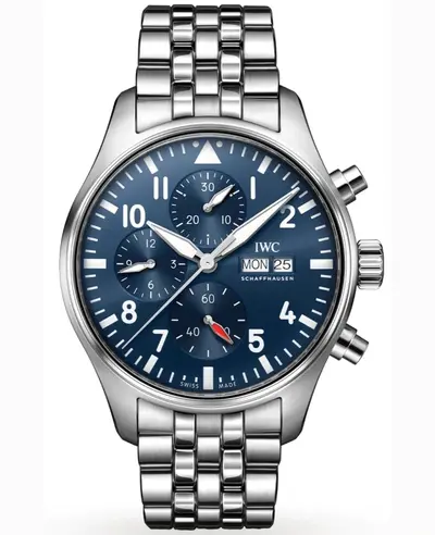 Brand New Authentic IWC Pilot's Chronograph watch. Stainless steel case, stainless steel bracelet band. Blue dial features silver tone hands and Arabic numeral/index hour markers with minute track around the outer rim, plus three sub-dials (60 second, 30 minute, 12 hours). Equipped with automatic mechanical movement powered by Calibre 69385, includes day of week and date display in the 3 o'clock position. Water resistant to 100 meters / 330 feet depth. Sapphire crystal lens is scratch-resistant. Round case measures 43mm diameter and has a thickness of 14.8mm; transparent sapphire case back allows visibility. Secured by a screw-in crown.