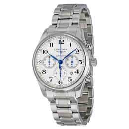 Stainless steel case with a stainless steel bracelet. Fixed stainless steel bezel. Silver (barleycorn) dial with blue hands and Arabic numeral hour markers. Minute markers around the outer rim. Dial Type: Analog. Date display between the 4 and 5 o'clock positions. Chronograph - three sub-dials displaying: 60 second, 30 minute and 12 hour. Automatic movement with a 54-hour power reserve. Scratch resistant sapphire crystal. Pull / push crown. Transparent case back. Case diameter: 42 mm. Case thickness: 14.3 mm. Round case shape. Band width: 20.3 mm. Band length: 7 inches. Deployment clasp. Water resistant at 30 meters / 100 feet. Functions: chronograph, date, hour, minute, second. Casual watch style. Watch label: Swiss Made. Item Variations: L2 759 4 78 6, L2-759-4-78-6, L2/759/4/78/6, L27594786. Longines Master Collection Automatic Chronograph Mens Watch L27594786