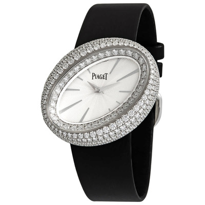 40 mm x 32 mm oval case in 18kt white gold, featuring a silver dial with silver-tone hands and index hour markers. Includes rotating diamond-set bezel on an 18kt white gold frame and black satin strap. Powered by Piaget Calibre 56P quartz movement, this analog watch displays hours and minutes only. Equipped with a sapphire crystal scratch-resistant glass, solid case back, tang clasp, and is water resistant to 20 meters / 65 feet.
