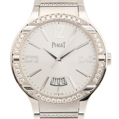 Men's Piaget Polo Automatic Diamond Silver Dial Watch. 18kt white gold case and bracelet with fixed diamond set bezel. Silver-tone dial featuring silver tone hands, index hour markers, outer minute markers, analog display, date window at 6 o'clock position. Powered by automatic movement. Equipped with scratch resistant sapphire crystal. Solid case back. Round case measuring 40 mm in diameter. Secured with a hidden clasp. Includes second hand function. Complete set of accessories: original box, international warranty card, manual.