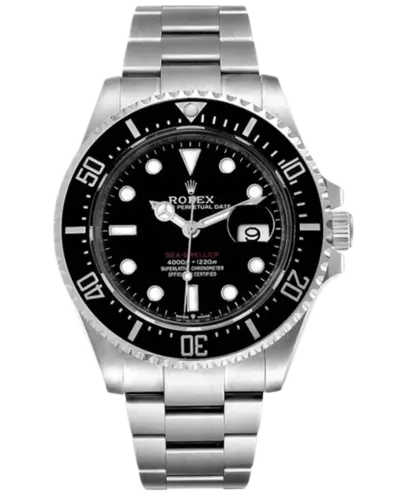 A brand new authentic Rolex Sea-Dweller watch with a black dial and Oystersteel case. Features include an Oystersteel bracelet, Oysterclasp folding clasp, unidirectional rotating bezel ring, silver-tone hour markers against the black face, automatic Chronometer movement (Rolex Calibre 3235), date display function, power reserve indicator showing up to 70 hours of autonomy provided by the self-winding mechanism, screw-down winding crown for water resistance and serviceability. The round case measures 43mm in diameter with a solid screw-down case back and sapphire crystal glass ensuring scratch resistance and clarity. This model is rated at 1200 meters / 4000 feet of water depth resistance making it suitable for deep-sea diving.