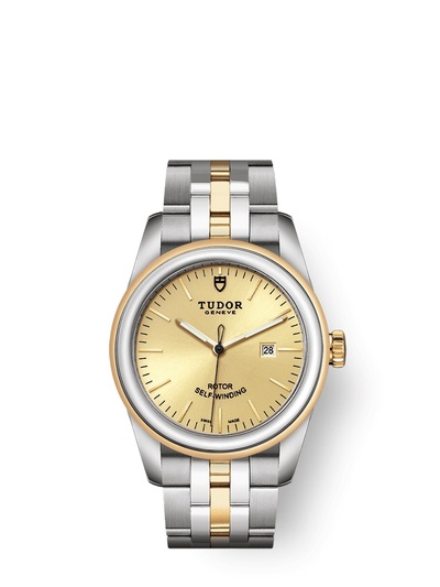 Automatic movement Tudor Calibre T201 based on ETA 2671. Contains 25 jewels beats per hour at 28800 vph power reserve up to 38 hours approximately. Fixed stainless steel bezel with two-tone (silver and gold) finish. Silver-tone stainless steel case. Champagne dial features tone gold hands luminescent coating index markers hour and minute indicators. Minute markers present on the outer rim analog display type date window located at the three o'clock position sapphire crystal scratch resistant material screw down winding crown solid case back round shape design 31mm size. Fold over clasp equipped with safety release mechanism water resistance depth up to 100 meters or 330 feet functions include hour minute second and date display luxury style Tudor Glamour Date Series item Swiss Made label.