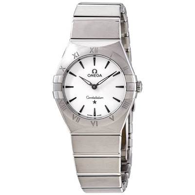 Analog, silver dial with luminous silver-tone hands and index hour markers; quartz movement - Omega calibre 4061; sapphire crystal crystal resistant to scratches; fixed stainless steel bezel; ladies' watch featuring a round case shape measuring 28 mm in diameter; equipped with a stainless steel bracelet of 17.5 mm width secured by a fold over clasp with push button release mechanism; solid case back design; water resistance up to 30 meters or 100 feet depth suitable for splashes and shallow immersion only; features hour and minute functions exclusively; luxury watch style, Swiss Made as indicated on the label; comes complete with original Omega box and comprehensive manual included.