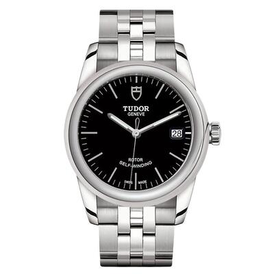 Silver-tone stainless steel case and bracelet, fixed silver-tone bezel with a black dial displaying analog time using silver-tone hands and index hour markers with luminescent coating for night visibility. Outer minute markers are present along the bezel edge; date display is located at the 3 o'clock position. Powered by Tudor Calibre T601 automatic movement based on ETA 2824, equipped with 25 jewels and a frequency of 28800 vph, offering approximately 38 hours power reserve. Features sapphire crystal for scratch resistance, screw down crown enhancing water resistance up to 100 meters / 330 feet, solid case back; round shape measuring 36 mm in diameter with fold over clasp including safety release mechanism. Includes date function and is a Swiss-made luxury watch from the Glamour Date series.