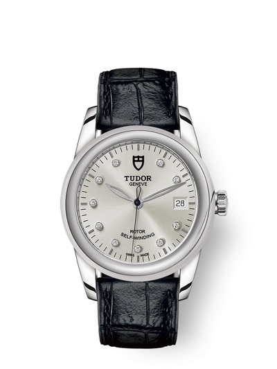 Automatic movement Tudor Calibre T601 based on ETA 2824. Silver-tone stainless steel case with black leather strap and fixed bezel. Silver dial features silver-tone hands, diamond hour markers, and minute markers around the outer rim. Analog display including date at the 3 o'clock position. Sapphire crystal scratch resistant. Screw down crown and solid case back. Round shape measuring 36 mm. Fold over clasp with safety release mechanism. Water resistant to 100 meters (approx. 330 feet). Functions include hour, minute, second, and date display.