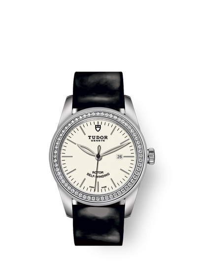 Silver-tone stainless steel case with a black leather strap. Features fixed bezel set with diamonds and an opaline dial displaying analog time, silver-tone hands, index hour markers, minute markers around the outer rim. Powered by Tudor Calibre T201 Automatic movement based on ETA 2671 containing 25 jewels beating at 28800 vph with approximately 38 hours power reserve. Equipped with scratch-resistant sapphire crystal, screw down crown and solid case back. Date display visible at the 3 o'clock position. Round case shape measuring 31 mm in diameter.