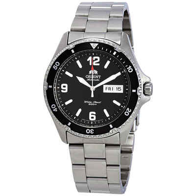 Stainless steel case with a stainless steel bracelet. Uni-directional rotating stainless steel bezel with a black top ring. Black dial with silver-tone hands and index hour markers. Arabic numerals mark the 6, 9 and 12 o'clock positions. Minute markers around the outer rim. Dial Type: Analog. Luminescent hands and markers. Day of the week and date display at the 3 o'clock position. Orient calibre F6922 automatic movement with a 40-hour power reserve. Scratch resistant mineral crystal. Screw down crown. Solid case back. Round case shape. Case size: 41 mm. Case thickness: 13 mm. Band width: 22 mm. Fold over clasp with a safety release. Water resistant at 200 meters / 660 feet. Functions: date, day, hour, minute, second. Dive watch style. Watch label: Japan Movt. Orient Mako II Automatic Black Dial Mens Watch FAA02001B9.